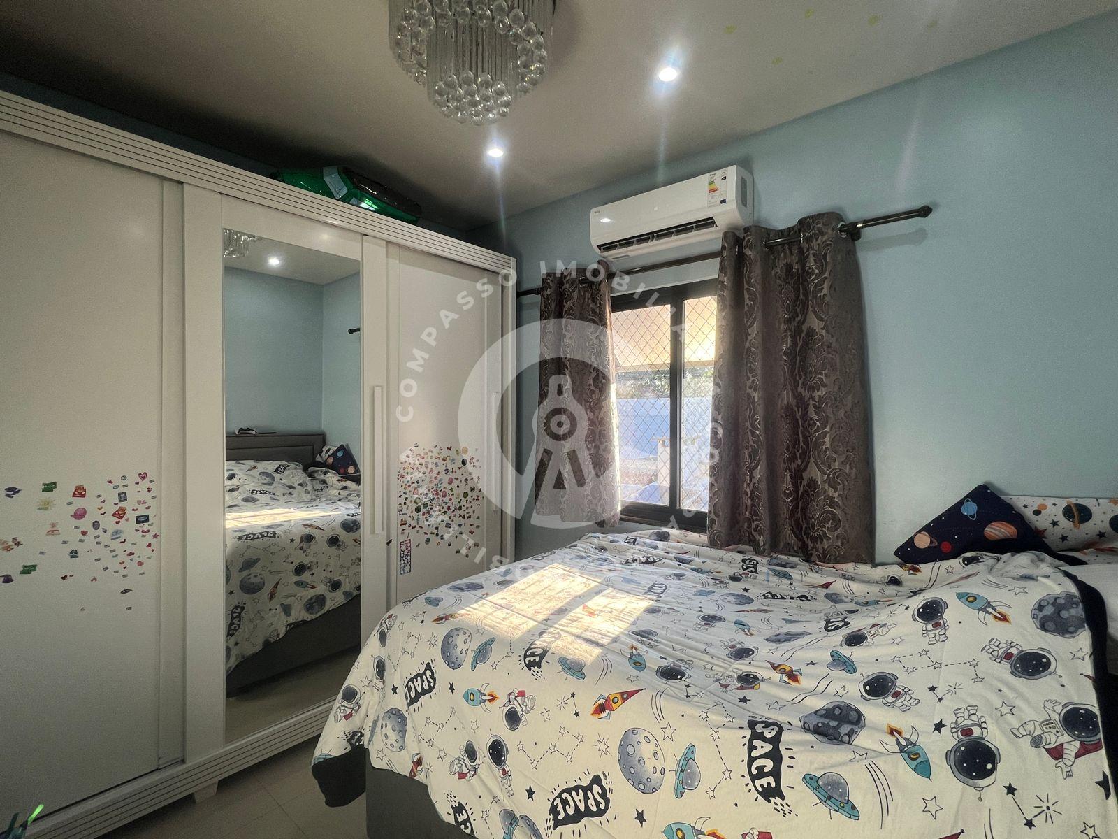 2 suítes, sendo uma delas com sacada, closet e guarda-roupa, e a segunda suíte com guarda roupas.